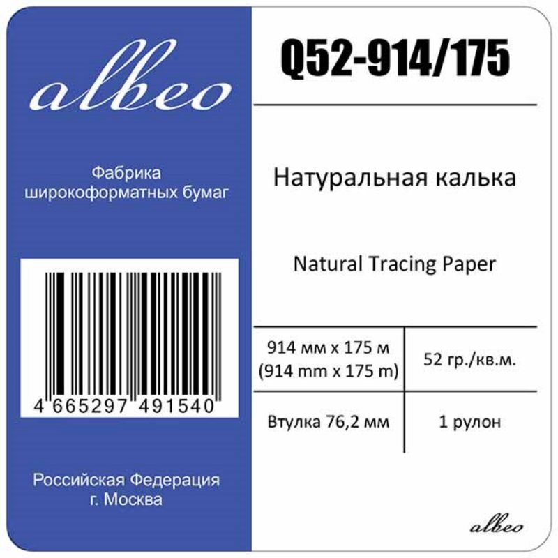 Калька бумажная для плоттеров A0+ Albeo 914мм х 175м, 52 г/кв.м, Q52-914/175