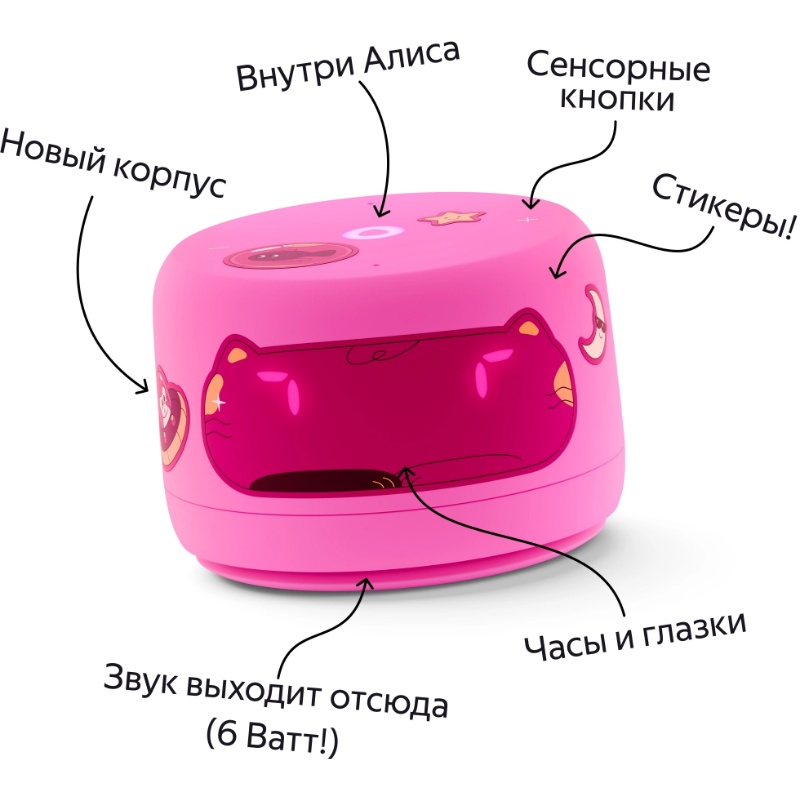 Со Станцией Лайт 2 дети могут играть, хулиганить и превращать умную колонку в необычных персонажей. Например, можно наклеить на колонку маску котика или межгалактического робота. А стикерами из набора здорово украшать и умную колонку, и всё вокруг.